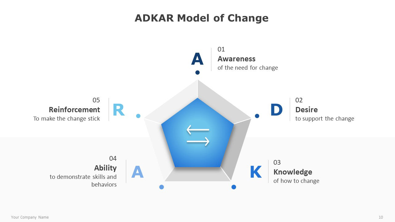 ADKAR is a business strategy and model for creating change within an organization. ADKAR is an acronym that means: Awareness, Desire, Knowledge, Ability, and Reinforcement. ADKAR is part of Prosci methodology and works together with the PCT Model.